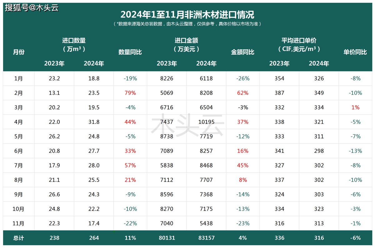从进口布局来看,非洲原木和锯材的表示呈现两极分化。数据显示,具体而言,11月非洲原木的进口量大幅下滑至9。63万立方米,取2023年同期比拟削减了44%,平均进口单价也下降了8%。