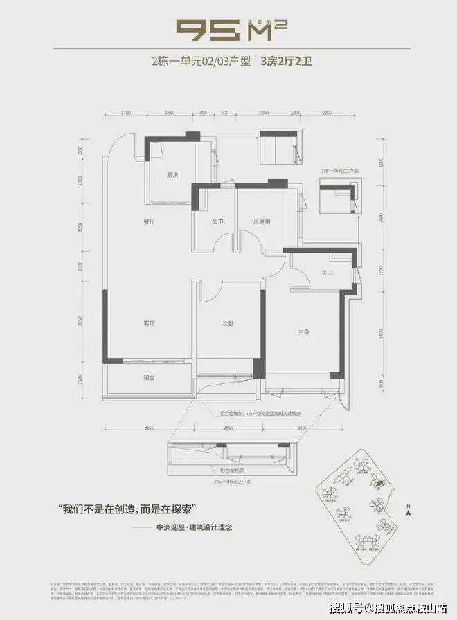 95㎡的3房2厅2卫,仅2栋1单位02/03户型,设想的是竖厅款式,客堂3。6米开间,进门入户玄关,LDKB一体化设想,三开间朝南,3个卧室别离做到了3。2米/2。8米/2。6米的宽度,U型厨房,得房率:77。48%(不含赠送),阳台进深1。5米,东南朝向。