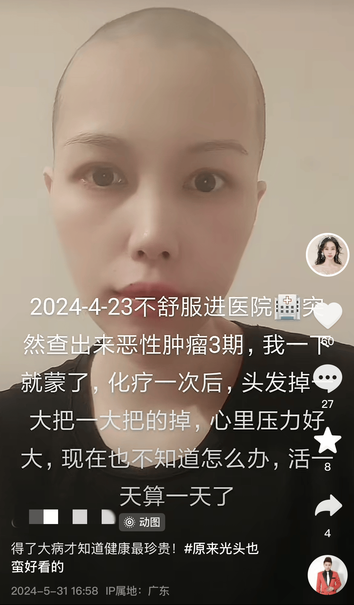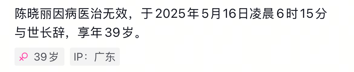 5月16号晚,抗癌网红圈传出哀思动静,来自广东的博从“木子”倒霉归天,常年39岁。其老友用其视频账号分享讣告,透露其归天的时间为16号凌晨6点15分。
