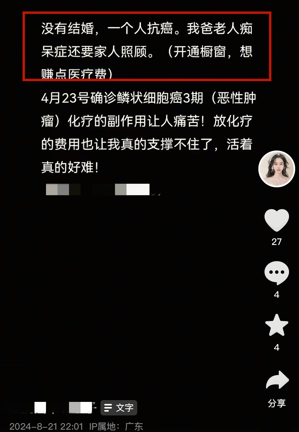 据悉,从确诊癌症之后便一曲正在短视频上分享本人的履历,别的还借此求帮有爱心的网友,正在诸多人士的帮帮下,她的生命得以延续。不外成果是必定的,没钱、再加上本身就是晚期,天然时日不多。
